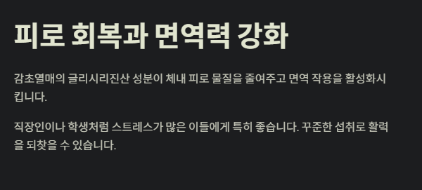 A. 감초열매는 피로 회복, 기관지 진정, 피부 염증 완화, 간 기능 보호, 위 건강 개선 등 다양한 효과를 지닌 천연 재료입니다.