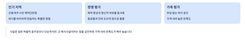 시설은 일반 퍼블릭 골프장보다 단순하지만, 군 복지시설이라는 점을 감안하면 가격 대비 만족도가 매우 높습니다.