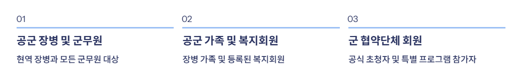 A. 원칙적으로 공군 장병과 가족이 이용 대상이지만, 일부 지역은 복지재단 협약회원에게 제한 개방됩니다.