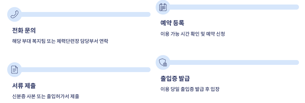 - 해당 부대 복지팀 또는 체력단련장 담당부서에 전화 문의