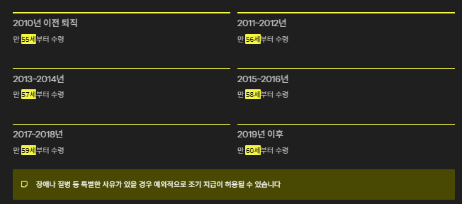 | 기본 개시 나이 | 55~60세(퇴직 연도별 상이) |