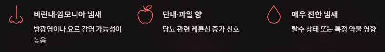 - 단내, 과일 향 → 당뇨 관련 케톤산 증가