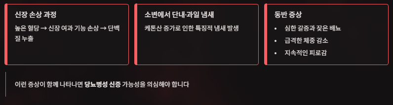 이런 증상이 함께 있다면, 단순한 거품이 아니라 당뇨성 신장 질환(당뇨병성 신증)일 가능성이 있습니다.