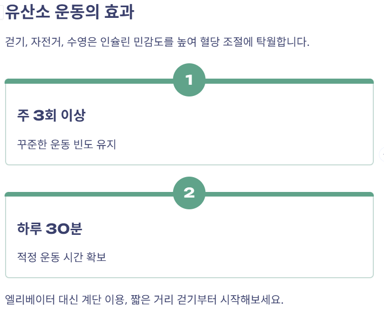 | 운동 | 주 3~4회, 30분 유산소 운동 |