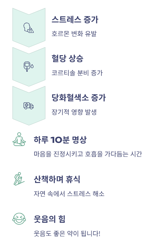 스트레스를 받으면 호르몬 변화로 인해 혈당이 올라갈 수 있습니다. 당화혈색소 역시 영향을 받기 때문에 마음 건강도 함께 챙기는 것이 중요합니다. 하루 10분 명상이나, 산책하면서 잠깐 숨을 고르는 시간도 큰 도움이 됩니다.