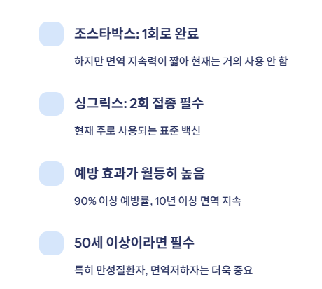 | 조스타박스 (Zostavax) | 생백신 | 1회 | 없음 | 한 번 접종으로 끝나지만, 면역 지속력이 약함 (5년 내외) |
