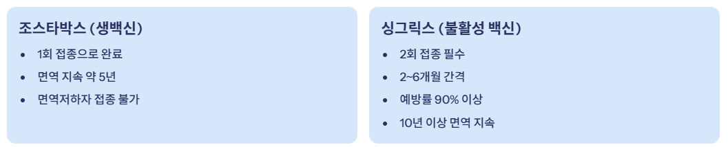 반면 싱그릭스는 면역 효과가 90% 이상으로 매우 높고, 고령자나 만성질환자도 안전하게 맞을 수 있어 현재는 싱그릭스 2회 접종이 표준으로 자리 잡았습니다.