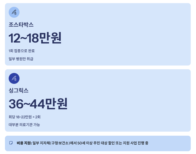 반면 싱그릭스는 면역 효과가 90% 이상으로 매우 높고, 고령자나 만성질환자도 안전하게 맞을 수 있어 현재는 싱그릭스 2회 접종이 표준으로 자리 잡았습니다.