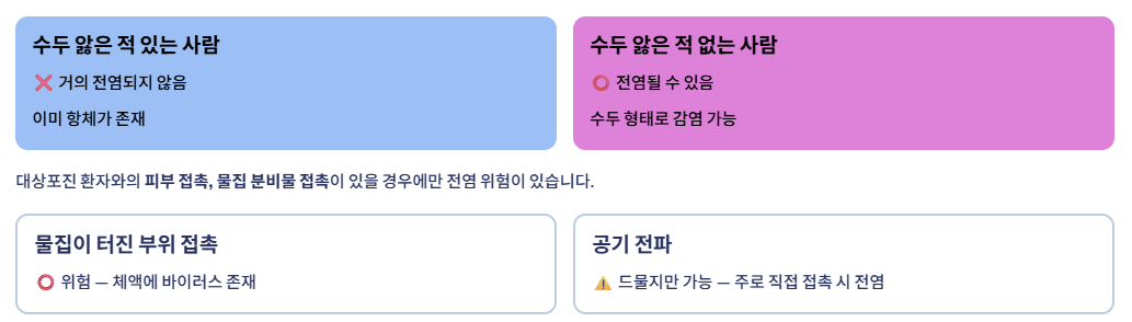수두 앓은 적 있는 사람 ❌ 거의 되지 않음 이미 항체가 있음