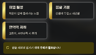 | 열 및 몸살 | 감기처럼 미열과 전신 피로 동반 |
