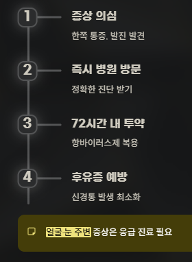 초기 증상이 의심된다면 늦지 않게 병원에 가는 것이 좋습니다. 항바이러스 약물은 발진이 생긴 후 72시간 내에 복용해야 효과가 가장 좋습니다. 늦어질수록 통증이 오래가고, 후유증인 신경통이 남을 수 있으므로 빠른 대처가 중요합니다. 특히 얼굴 주변, 눈 주변에 생기면 응급 진료가 필요할 수 있습니다.