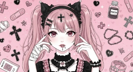 A. 핑크·블랙·화이트 등 감정적인 색 조합에 리본, 붕대, 하트 같은 아이템을 더한 독특한 스타일입니다.