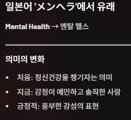 멘헤라(メンヘラ)는 일본어 ‘멘탈 헬스(mental health)’ 에서 파생된 단어로, 처음에는 단순히 정신건강을 챙기자는 의미로 사용되었습니다. 그러나 시간이 지나면서 인터넷 문화 속에서 조금 다른 뉘앙스로 쓰이게 되었어요.