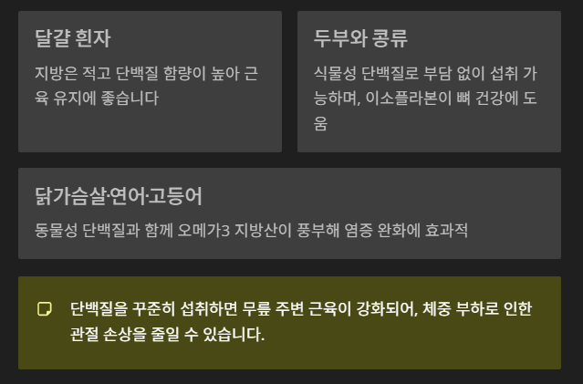 단백질을 꾸준히 섭취하면 무릎 주변 근육이 강화되어, 체중 부하로 인한 관절 손상을 줄일 수 있습니다.