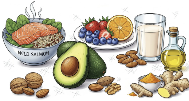 - 닭가슴살, 연어, 고등어: 동물성 단백질과 함께 오메가3 지방산이 풍부해 염증 완화에도 효과적입니다.