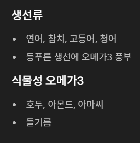 - 등푸른 생선이나 견과류를 꾸준히 먹기