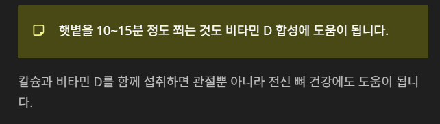 - 햇볕을 10~15분 정도 쬐는 것도 비타민 D 합성에 도움이 됩니다.