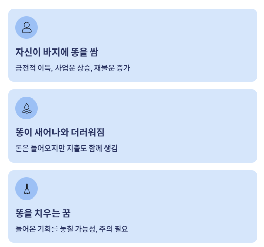 특히 바지에 똥을 싸는 꿈은 내 옷(즉, 내 영역)에 재물이 들어온다는 뜻으로, 예상치 못한 돈이나 이익이 생길 징조로 보는 경우가 많습니다.