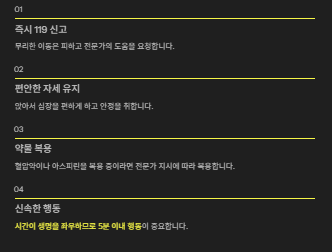 만약 병원에 가기 전이라면 편안한 자세로 앉아 심장을 편하게 하고, 혈압약이나 아스피린을 복용 중이라면 전문가 지시에 따라 복용하세요.
