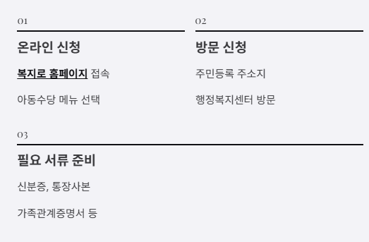 - 온라인 신청 : 복지로 홈페이지 접속 → 아동수당 메뉴 선택