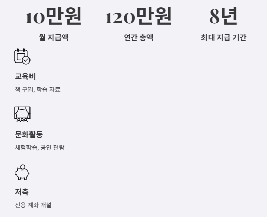 아이의 책 구입비, 문화활동비, 용돈 저축 등으로 활용하면 성장 과정에 실질적인 도움이 됩니다.