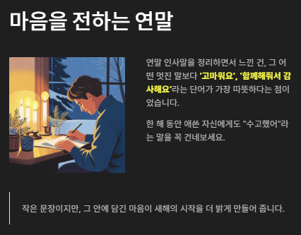 - “올 한 해의 끝자락에서, 수고한 당신께 작은 위로와 응원을 보냅니다.”