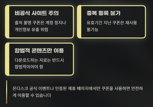 온디스크 무료 다운로드 쿠폰을 정리하면서 느낀 점은, 공식 이벤트만 잘 챙겨도 충분히 무료 혜택을 누릴 수 있다는 것이었어요. coupon을 받기 위해 비공식 경로를 이용하는 분들도 있지만, 오히려 보안 위험이 크기 때문에 추천하지 않습니다.