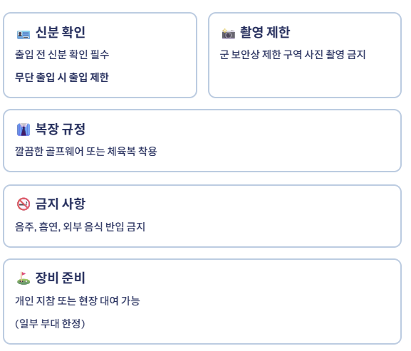 이용 시 신분증, 복지회원증 또는 초청장 지참이 필요하며, 부대 보안 절차를 반드시 따라야 합니다.