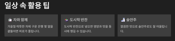 가을철 차나 간식으로 구운 은행 몇 알을 곁들이면 피로가 풀리고, 따뜻한 느낌을 받을 수 있습니다. 또한 도시락 반찬으로도 좋고, 술안주로도 깔끔하게 어울립니다.