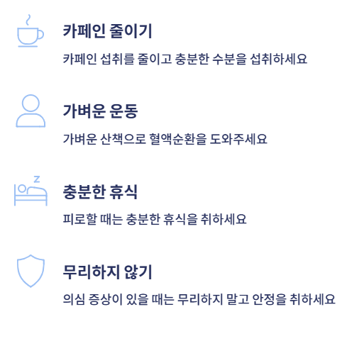 - 카페인 섭취를 줄이고 충분한 수분 섭취하기