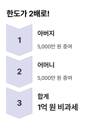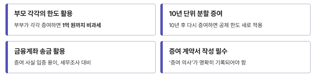 → 부부가 각각 증여하면 5,000만 원 × 2 = 1억 원까지 비과세 가능 - 10년 단위로 분할