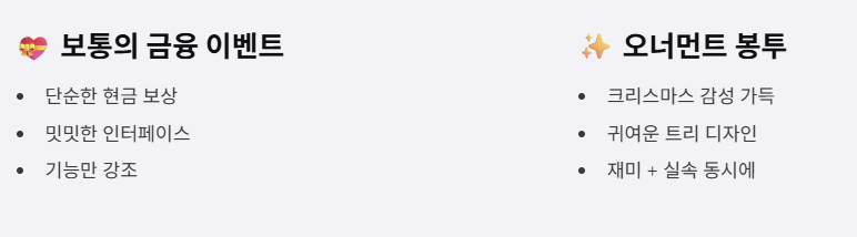 이번 케이뱅크의 ‘오너먼트 받기 봉투’ Event 를 살펴보면서 느낀 건, 단순한 금융 혜택을 넘어 연말 분위기까지 챙긴다는 점에서 감성적 만족도도 매우 높다는 것입니다. 실제로 친구에게 봉투를 보냈을 때 "귀엽다", "이거 뭐야? 재미있다"는 반응이 나와서 서로 웃게 되더라고요.