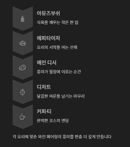 코스는 보통 아뮤즈부쉬(식전요리)로 시작합니다. 이후 에피타이저, 메인 디시, 디저트, 커피 또는 티 순서로 이어집니다.
