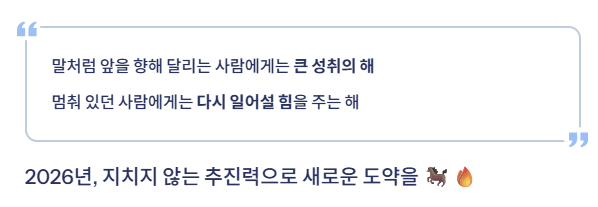 개인적으로는 이 해에 “지치지 않는 추진력”이라는 키워드가 잘 어울린다고 느꼈어요. 2026년에는 누구나 불타는 열정으로 목표를 이루는 한 해가 되길 바랍니다. 🐎🔥