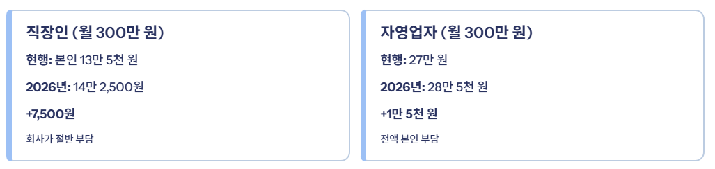 | 직장인 (월 300만 원 소득) | 본인 13만5천 원 | 14만2,500원 | 약 +7,500원 |