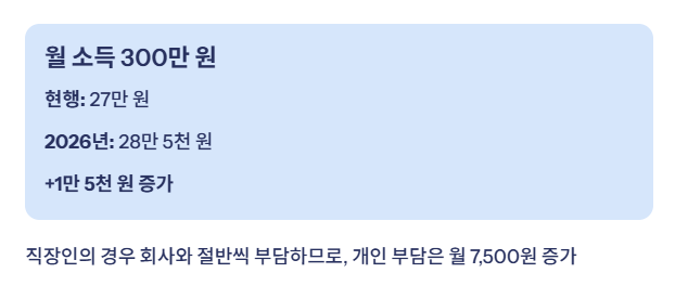 즉, 월 소득이 300만 원인 직장인의 경우, 현재는 27만 원(9%)을 내지만 2026년부터는 28만 5천 원(9.5%)으로 월 1만5천 원가량 부담이 늘어납니다.