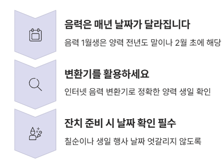 특히 칠순이나 생일 잔치를 준비할 때는 음력과 양력 차이로 인해 날짜가 엇갈리지 않도록 주의해야 합니다.