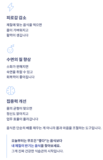 나에게 맞는 음식을 꾸준히 먹는 것만으로도 피로감이 줄고, 수면의 질이나 집중력까지 좋아지는 경우가 많습니다.