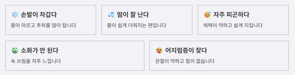 아래 테스트는 평소 생활 습관, 신체 반응, 식습관을 바탕으로 간단하게 자신에게 맞는 체질을 예측할 수 있도록 구성되어 있습니다. 각 문항에 대해 '그렇다'면 1점, '아니다'면 0점을 주시고, 가장 높은 점수를 받은 그룹이 현재 예상되는 체질입니다.