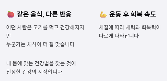 하지만 내 체질이 무엇인지 알기 어렵다면? 간단한 자가진단 테스트만으로도 어느 정도 방향을 잡을 수 있어요. 지금부터 함께 체크해보세요!